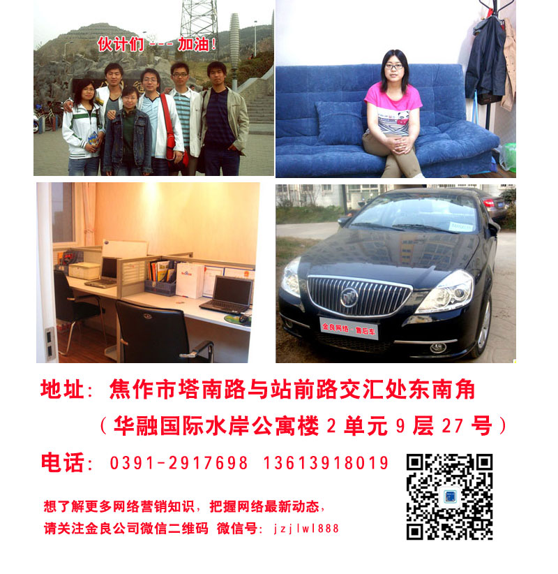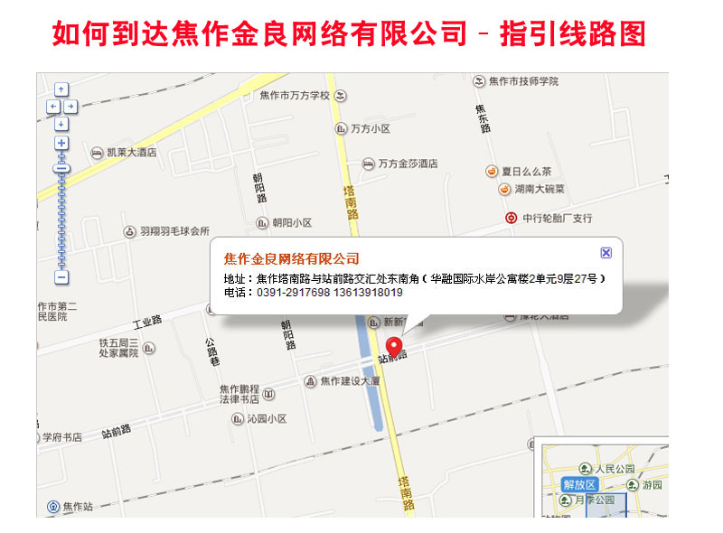 金良網(wǎng)絡公司-因業(yè)務拓展需求,搬遷到焦作市塔南路與站前路交叉口東南角(華融國際水岸公寓樓2單元9層27號)。原來聯(lián)系手機和電話都沒有變化,給客戶(朋友)們帶來不便,請諒解!網(wǎng)站建設,百度推廣,微信公眾號服務,淘寶店鋪裝修,400電話辦理,有問題聯(lián)系景子良13613918019