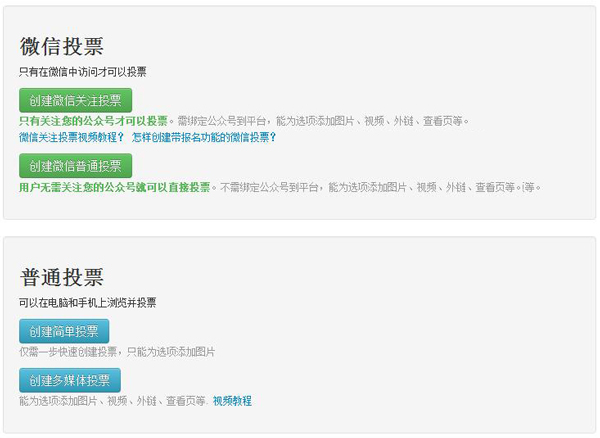 投票類(lèi)型 簡(jiǎn)單投票 簡(jiǎn)單投票適合創(chuàng)建比較簡(jiǎn)單的投票只需一步即可創(chuàng)建完成,但是創(chuàng)建只能為選項(xiàng)添加圖片。 多媒體投票 多媒體投票適合創(chuàng)建功能豐富的投票,選項(xiàng)中不僅可以添加圖片還可以添加視頻引用、外鏈、新頁(yè)面等。